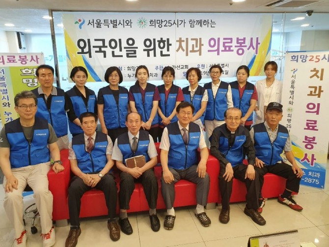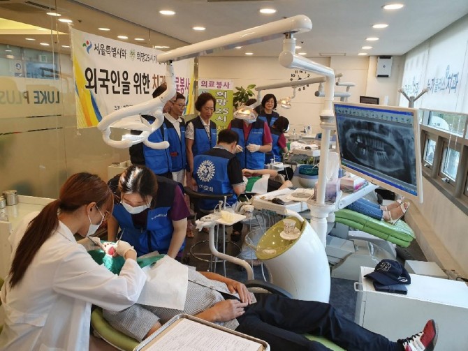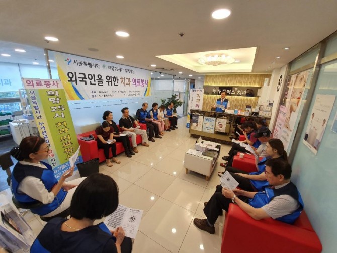 누가플러스치과에서 외국인 취약지역인 근로자 다문화가정 새더민 의료봉사를 하며, 누가요양복지센터에서는