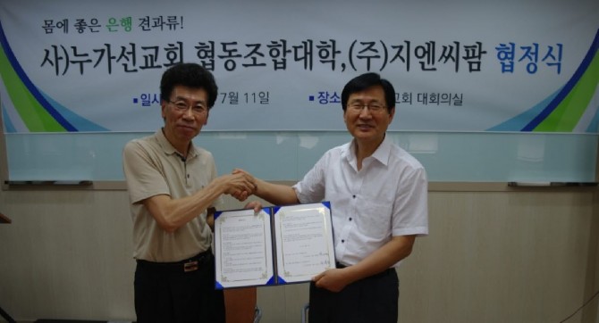 (사) 누가선교회와 협동조합대학과 (주)지엔씨팜은 2015년 7월 11일 누가선교회 대회의실에서 업무협정식을 가졌다.