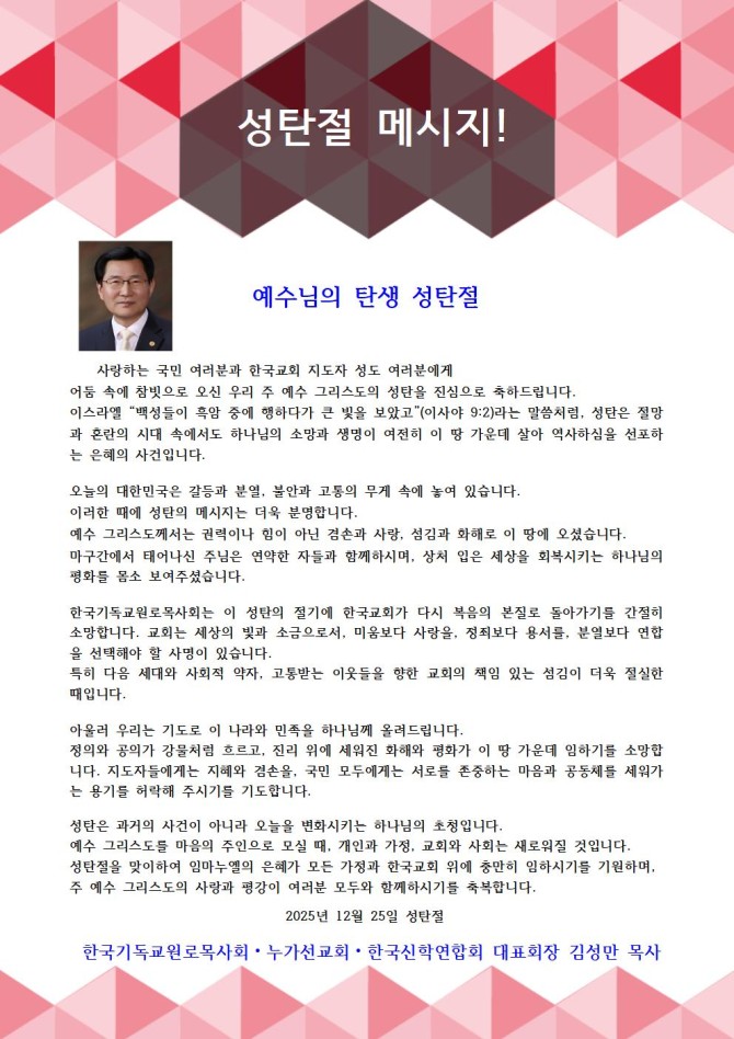 한국기독교원로목사회는 이 성탄의 절기에 한국교회가 다시 복음의 본질로 돌아가기를 간절히 소망합니다. 교회는 세상의 빛과 소금으로서, 미움보다 사랑을, 정죄보다 용서를, 분열보다 연합을 선택해야 할 사명이 있습니다.