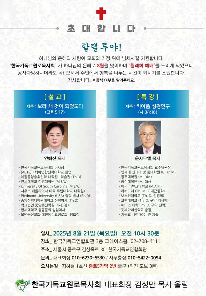 누가선교회와 한국기독교원로목사회 8월 광복절 기념 예배 페이지 정보 작성자 관리자 댓글 0건 조회 533회 작성일 25-08-08 02:20 목록 본문 누가선교회와 한국기독교원로목사회 8월 광복절 월례 감사예배서를 드립니다. 댓글 0 댓글목록 등록된 댓글이 없습니다.