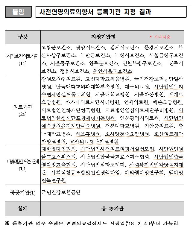 사전연명의료의향서 등록기관 지정 결과